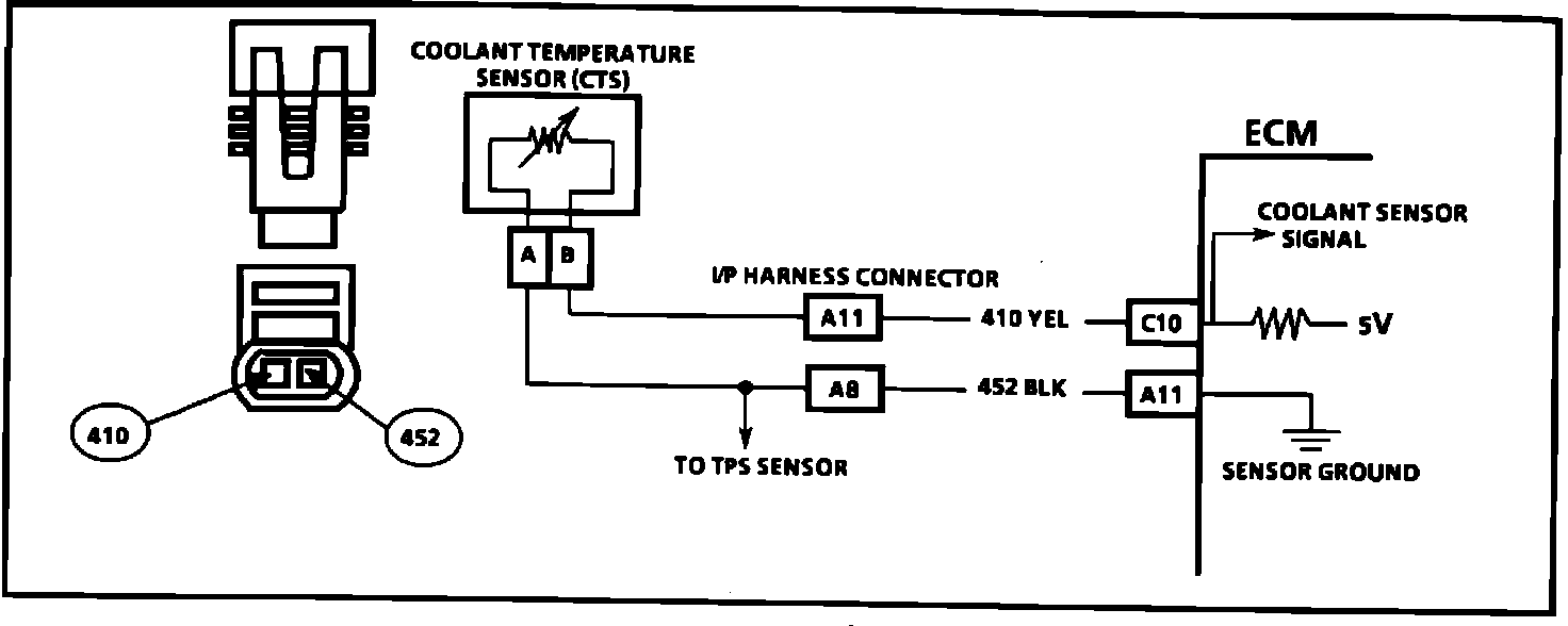 The computer sends a 5.0 volt signal to the coolant temperature sensor through a resistor in the ECM and measures the voltage. The voltage will be high or low depending on coolant temperature. By varying the voltage, the computer will sense engine coolant temperature.