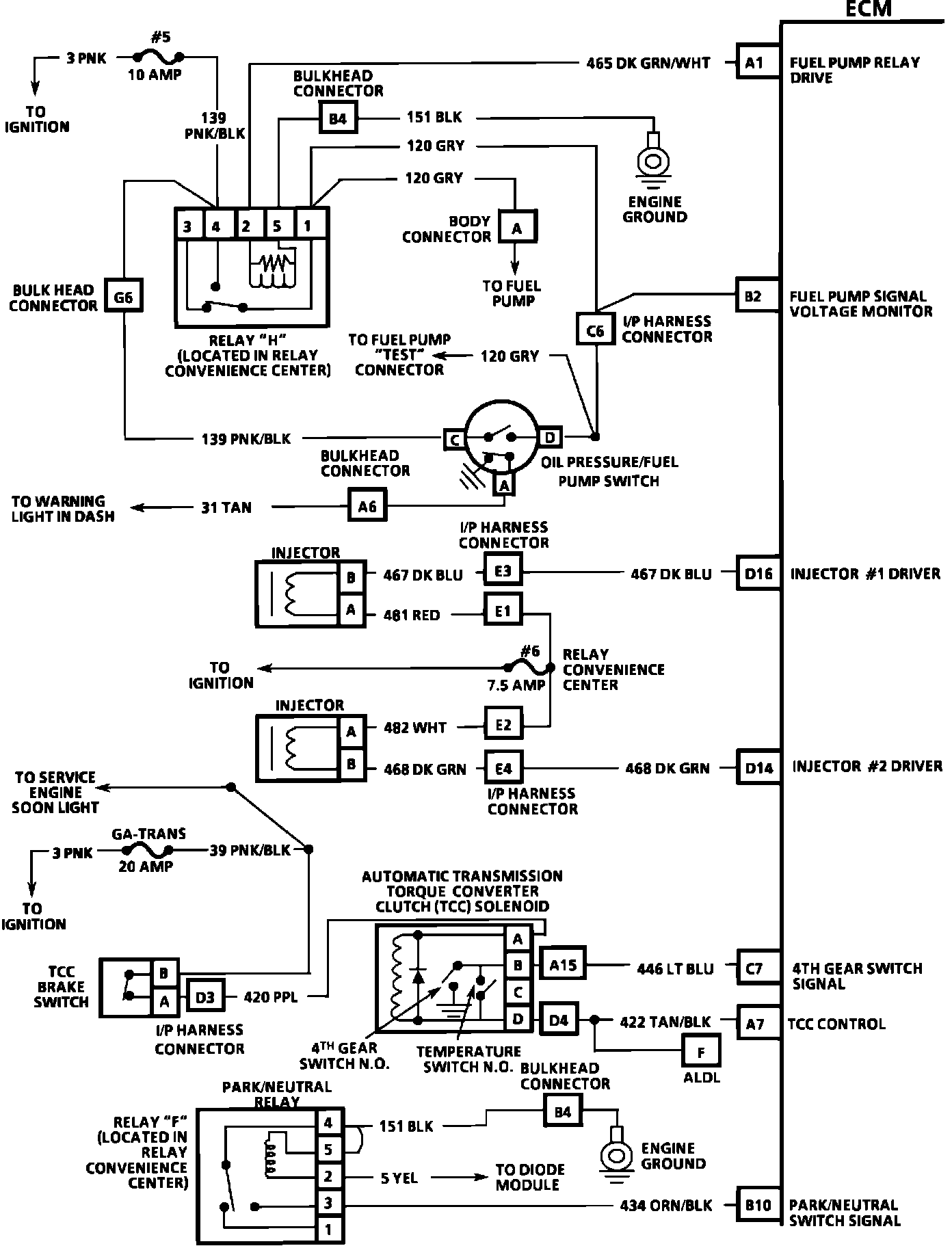 The oil pressure switch is mounted on the engine. This switch operates as a parallel power supply with the fuel pump relay to supply battery voltage to the fuel pump. Voltage is supplied to the fuel pump after approximately 28 kPa (4 PSI) oil pressure is reached.