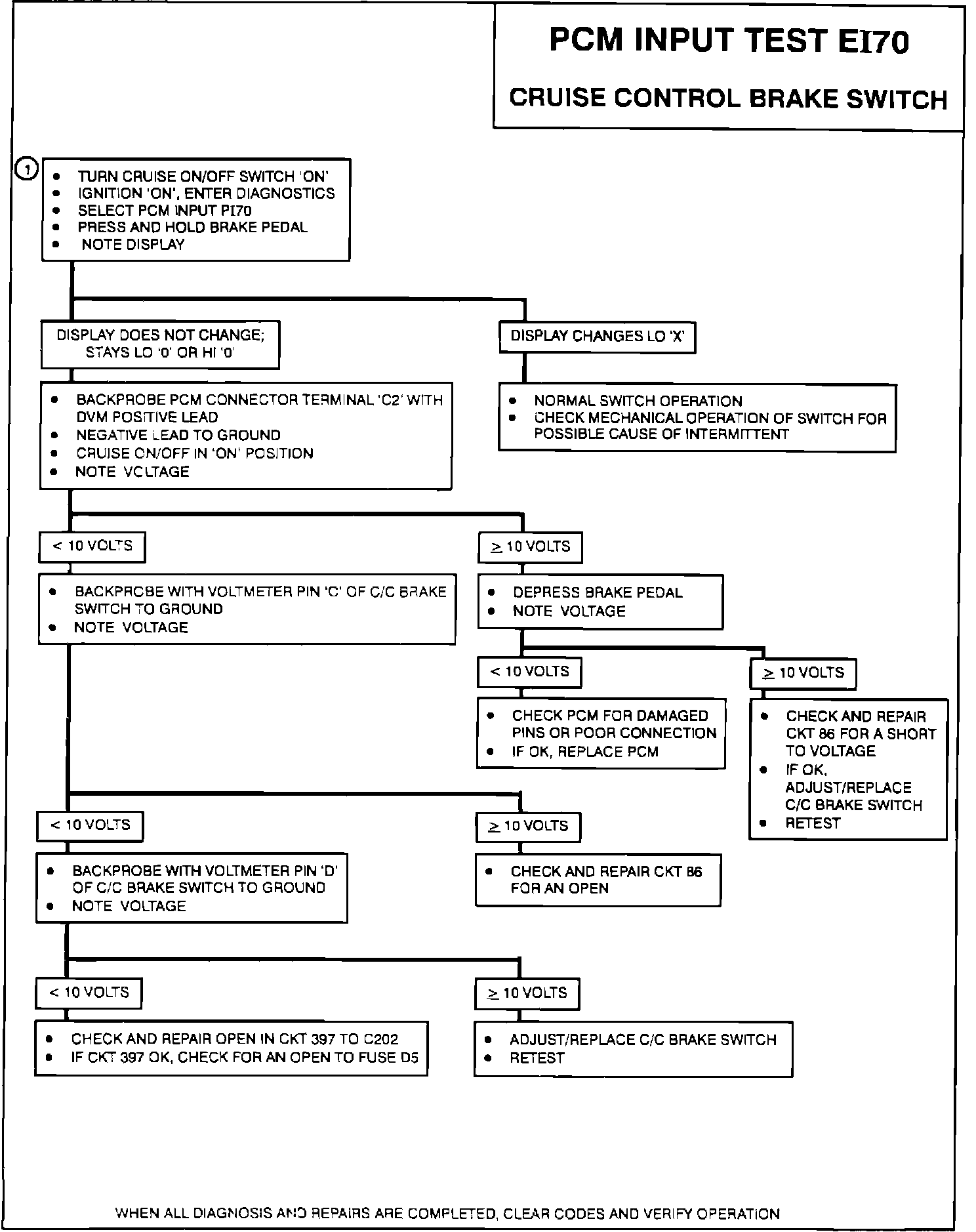After the diagnostic trouble codes have been displayed the Driver Information Center (DIC) will display "ECM?". Depress the HI blower button. The display will change to read "ECM DATA?". Depress the LO blower button. The display will change to read "ECM INPUTS?". Place the cruise control ON/OFF switch in the ON position. Depress the HI blower button. The display will change to read HI '0' C/C brake EI70. When the brake pedal is depressed and released the display will change to read HI 'X'. The change from '0' to 'X' indicates that the test has been successfully completed.