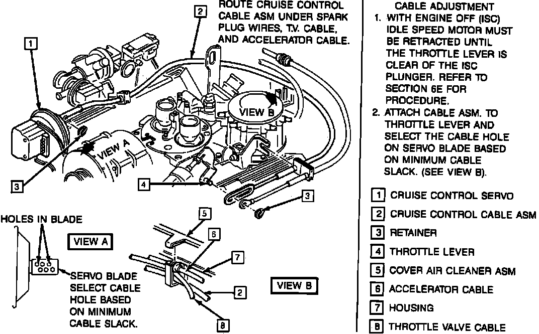 On fuel injected models, a cable is used in this system. The servo unit positions the throttle linkage through the use of a cable. To adjust this cable turn engine to the ``Off'' position. Retract idle speed control (ISC) motor plunger, throttle lever must not touch ISC plunger. Connect cruise control cable to servo hole blade, Fig. 3, that allows minimum slack.