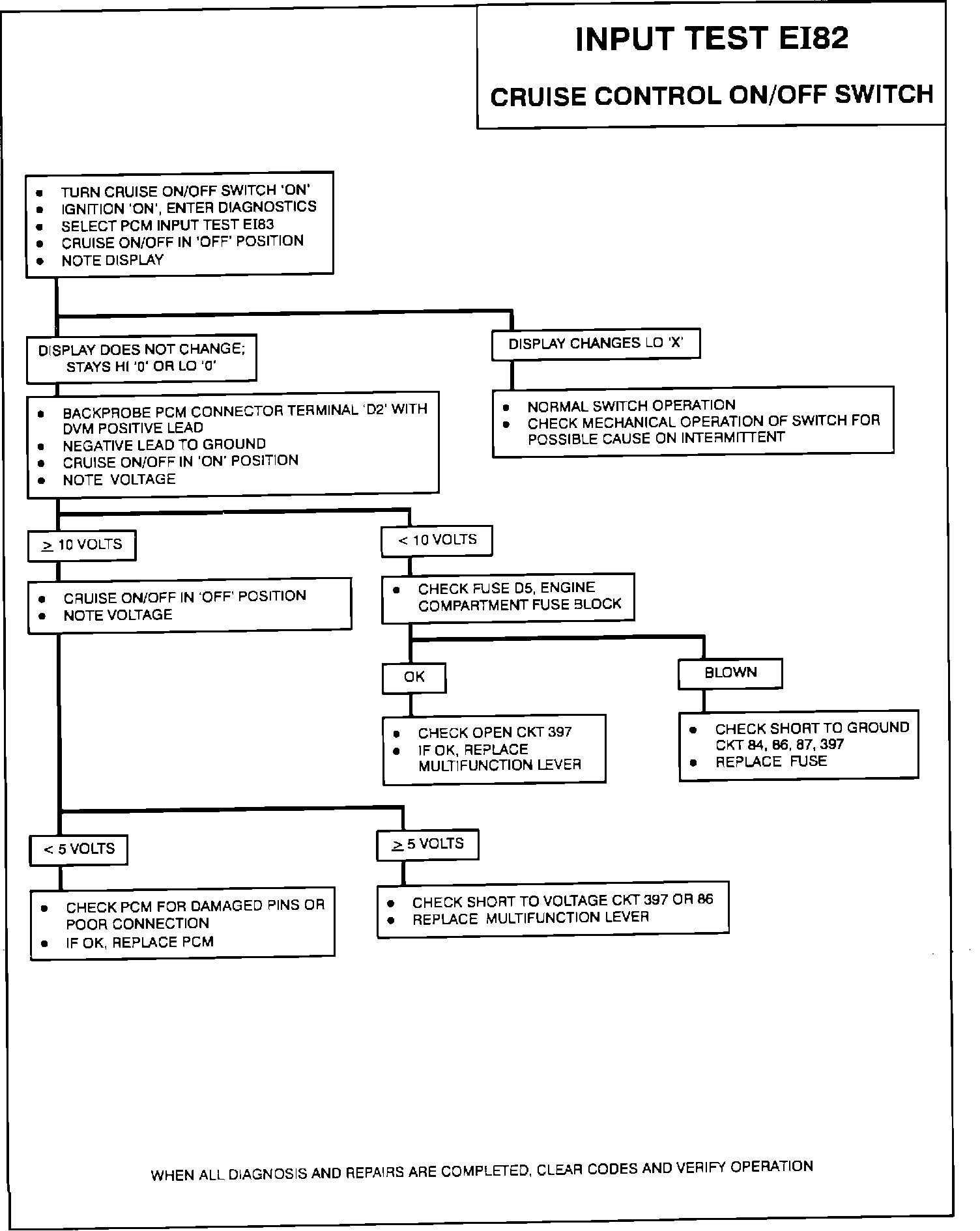 After the diagnostic trouble codes have been displayed, the Driver Information Center (DIC) will display "ECM?". Depress the HI blower button. The display will change to read "ECM DATA?'. Depress the LO blower button. The display will change to read "ECM INPUTS?". Depress the HI blower button. The display will change to read EI70. Place the cruise control ON/OFF switch in the ON position. Depress the LO blower button four times. The display will change to read LO 0 EI82. When the cruise control ON/OFF switch is placed in the ON position the display will change to read HI X. The change from 0 to X indicates that the test has been successfully completed.