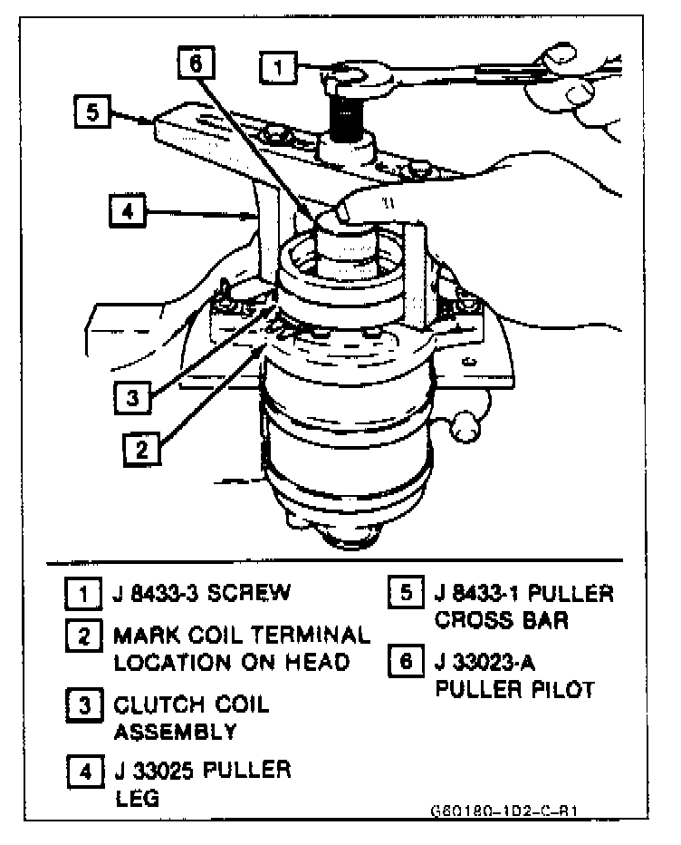 Remove or Disconnect1. Perform Steps 1 through 4 of "Clutch Rotor and/or Bearings" removal procedure. Mark clutch coil terminal location on compressor front head.