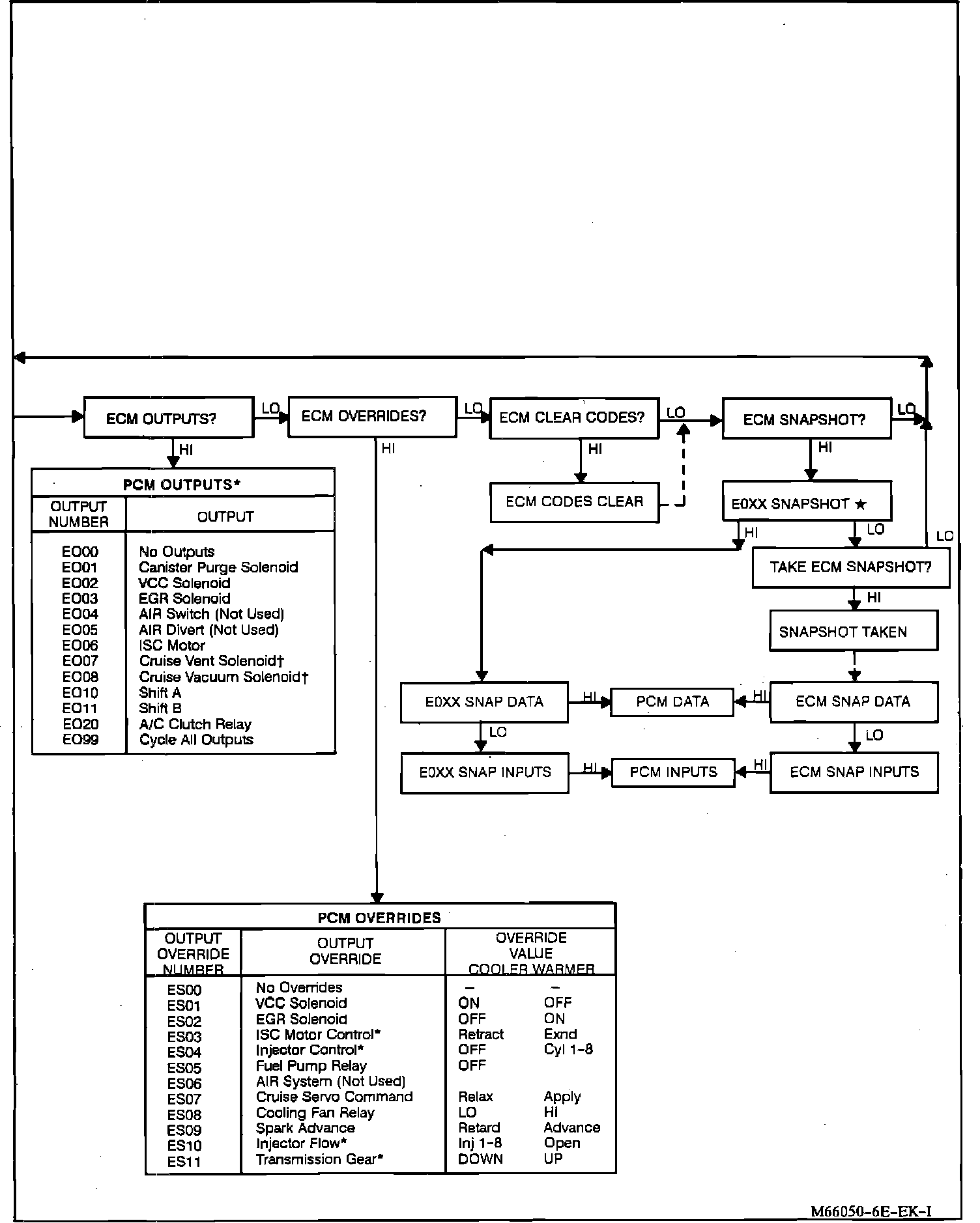 4. Depressing the "LO" button after override is displayed will put the system into "ECM CLEAR CODES?" display. Depressing "HI" or "LO" at this point will either clear codes or bypass code clearing.