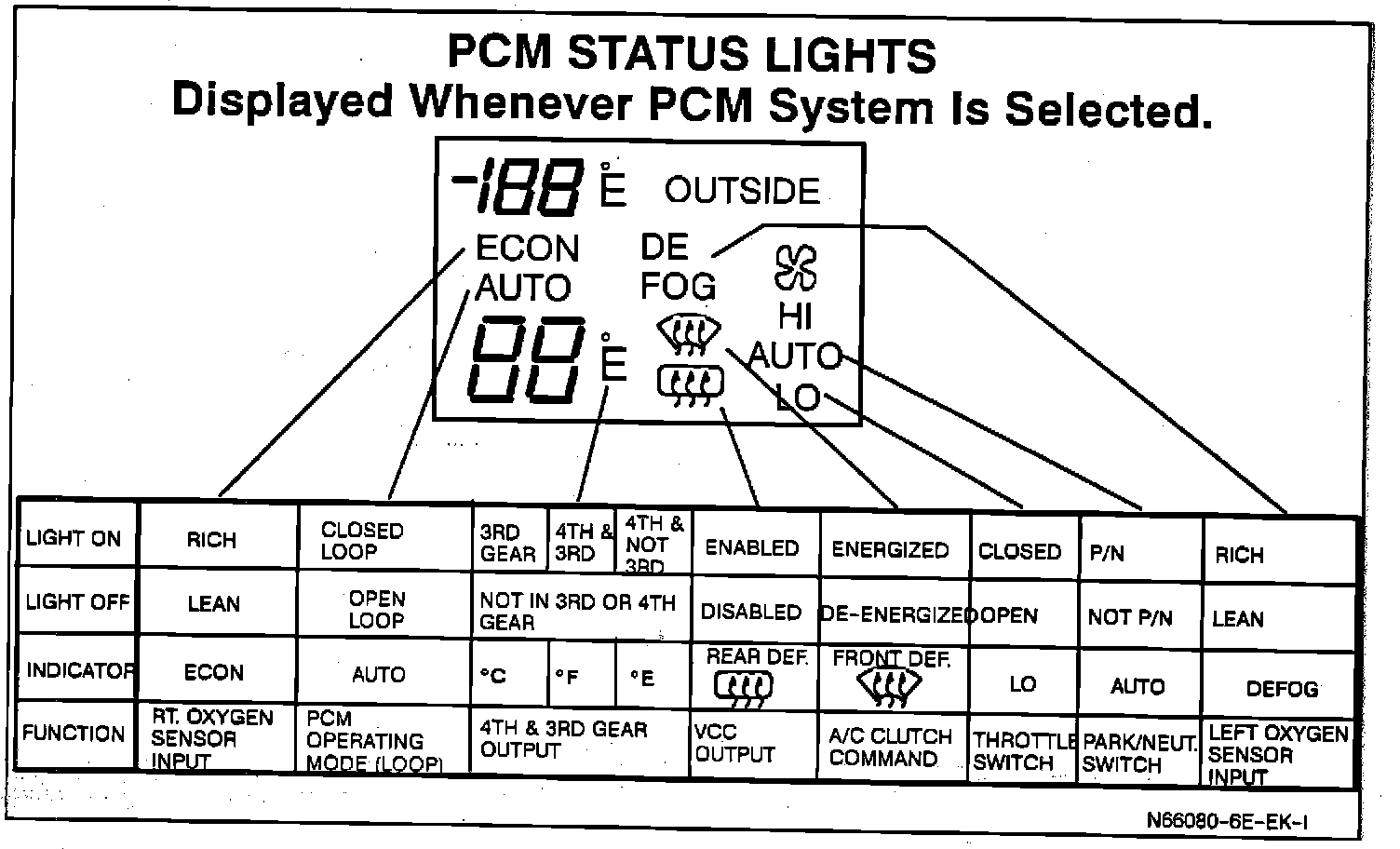 After the segment check, any trouble code stored in computer memory will be displayed. Codes may be stored for the PCM, IPC, ACP, or SIR systems.