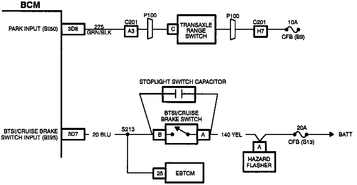 The BCM monitors the park input "3D8" which receives ignition voltage through the transaxle range switch during park. The BCM also monitors the stop light switch input 3D7 which receives voltage through the normally open BTSI/Cruise Brake Switch. When the BTSI/Cruise Brake Switch is open (brake not applied), the BCM will detect 0 volt. If the BCM detects ignition voltage on pin "3D8" (vehicle in park) simultaneously for greater than 25 seconds, it will send the "APPLY BRAKE TO SHIFT" message to the CCDIC.