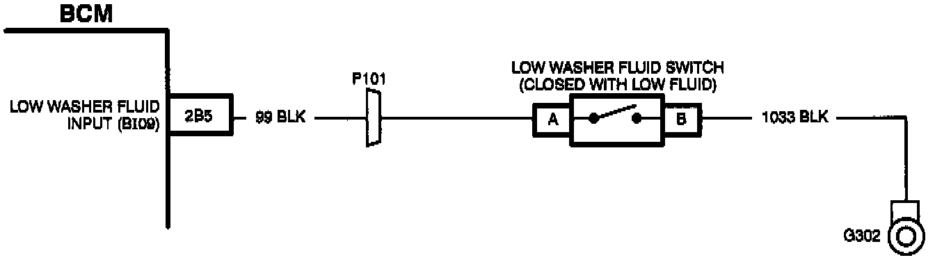 The BCM provides system voltage to the low washer fluid circuit, and the washer fluid level switch provides the single path to ground. The BCM supplies and internally monitors the voltage level of the circuit at pin "2B5." When the washer fluid level circuit is open the BCM will detect system voltage, but if the washer fluid level switch provides a path to ground (low washer fluid condition present), the BCM will detect low voltage. If this condition exists for at least 75 seconds, the BCM will send the "LOW WASHER FLUID" message to the CCDIC.