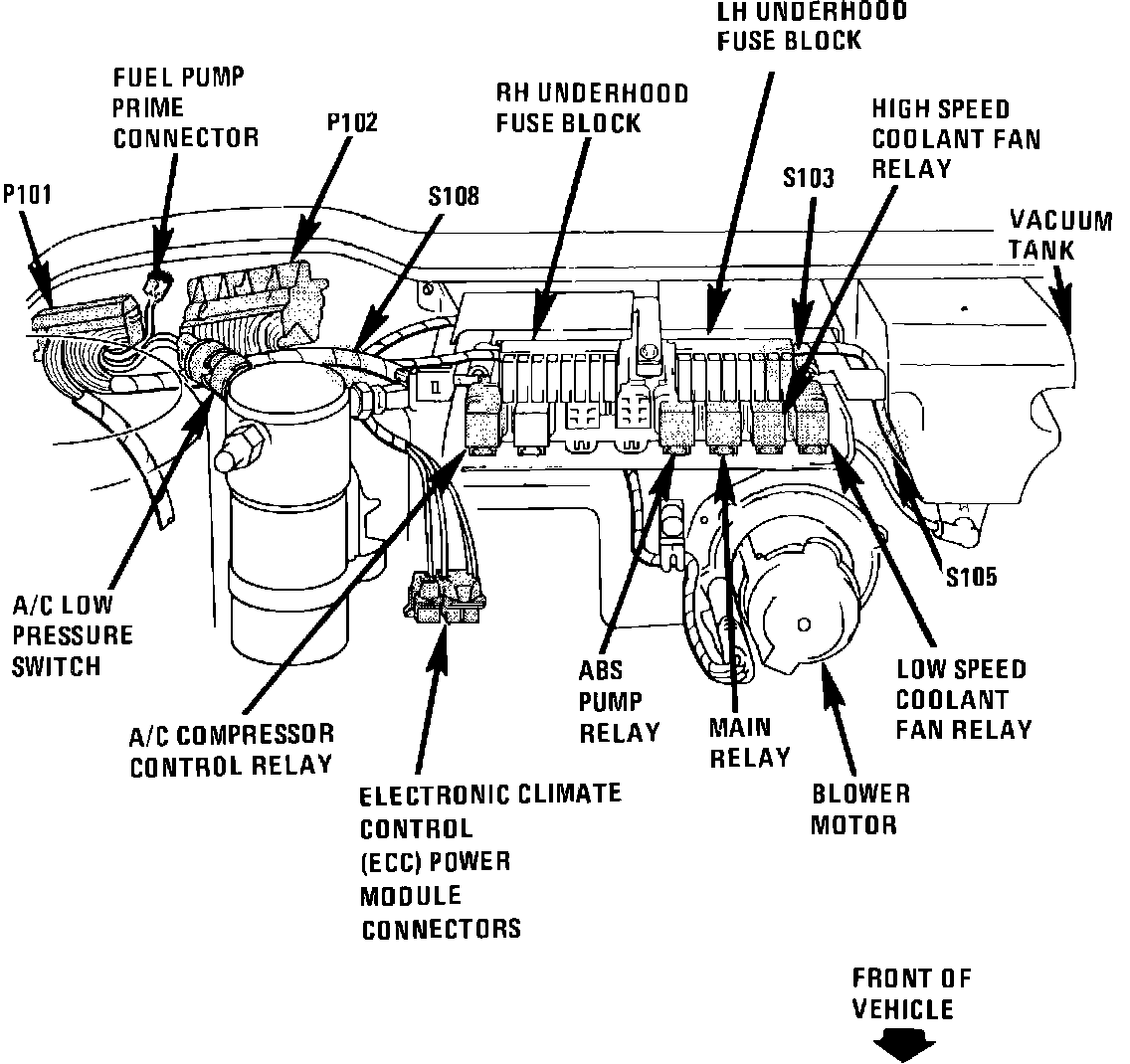 Center rear of engine compartment, below LH Underhood Fuse Block (behind Maxifuse/Relay Center Cover)