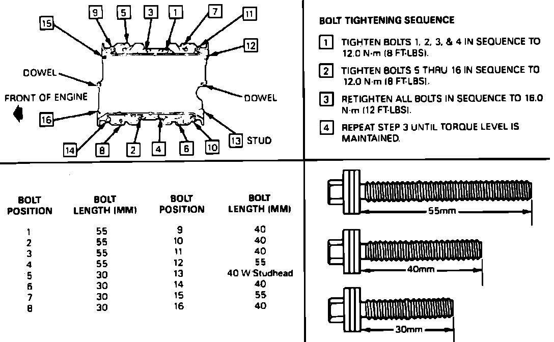 Fig. 6 Intake Manifold Bolt Size & Bolt Torque Sequence. 4.9L: