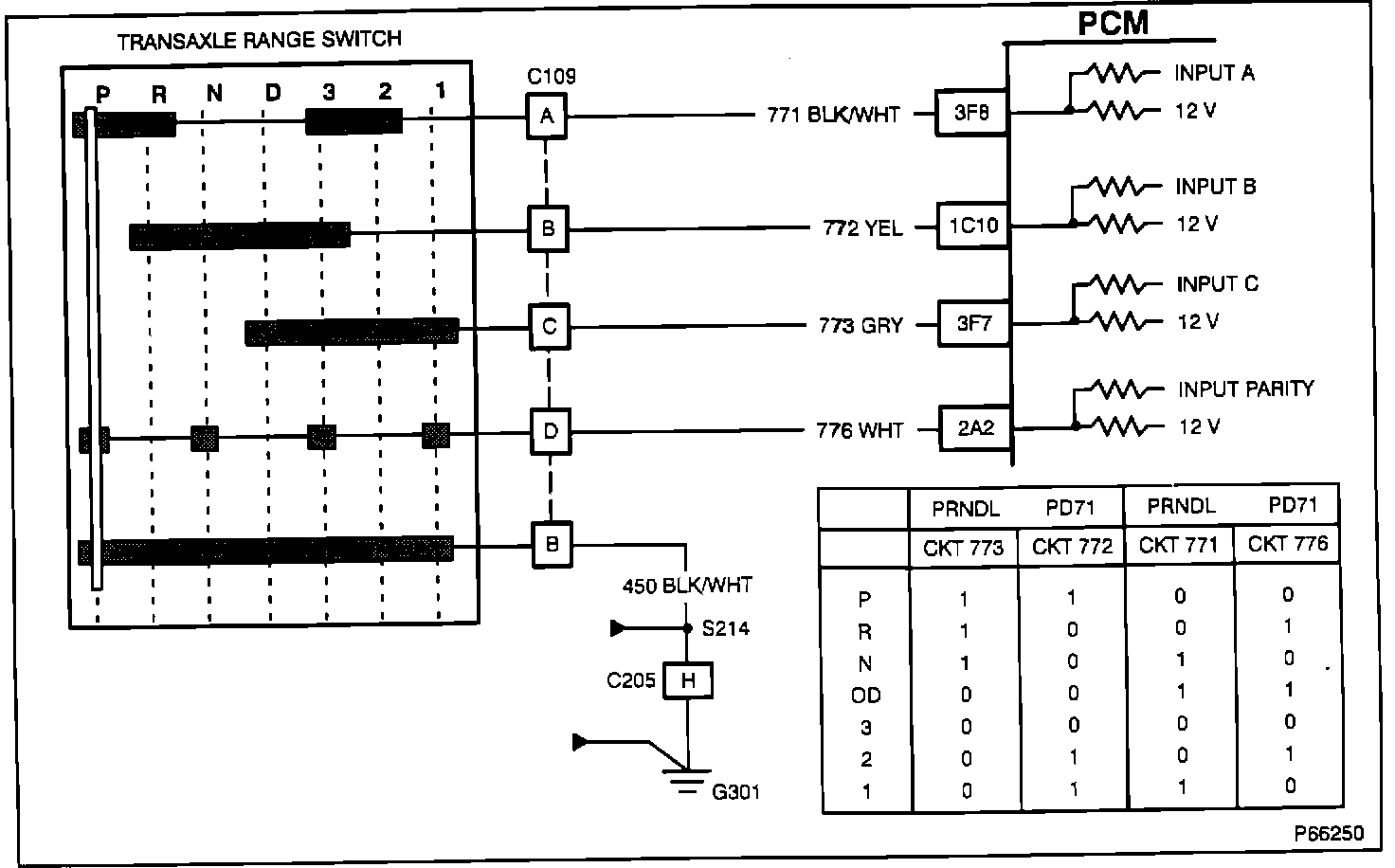 The PRNDL switch is part of the transmission Neutral Safety-Back Up (NSBU) Switch, located on the top of the transaxle. The PRNDL switch provides four inputs to the PCM to indicate the transmission gear position. Gear position information is used by the PCM to control shift solenoids and TCC operation. Improper switch operation will cause PCM code P091 to set.