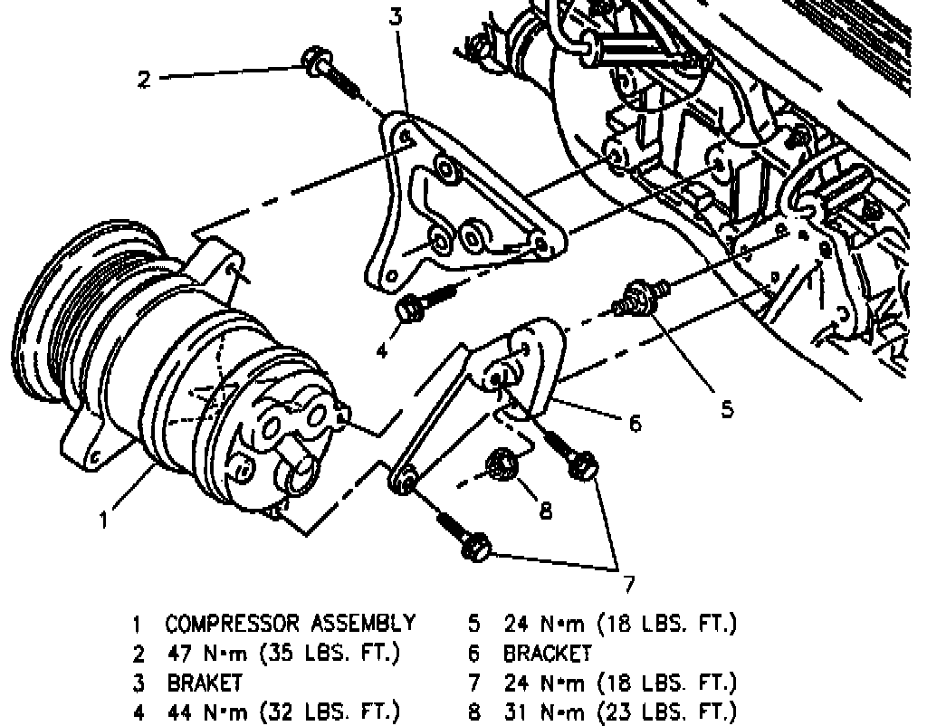 1. Compressor mounting bracket to vehicle.