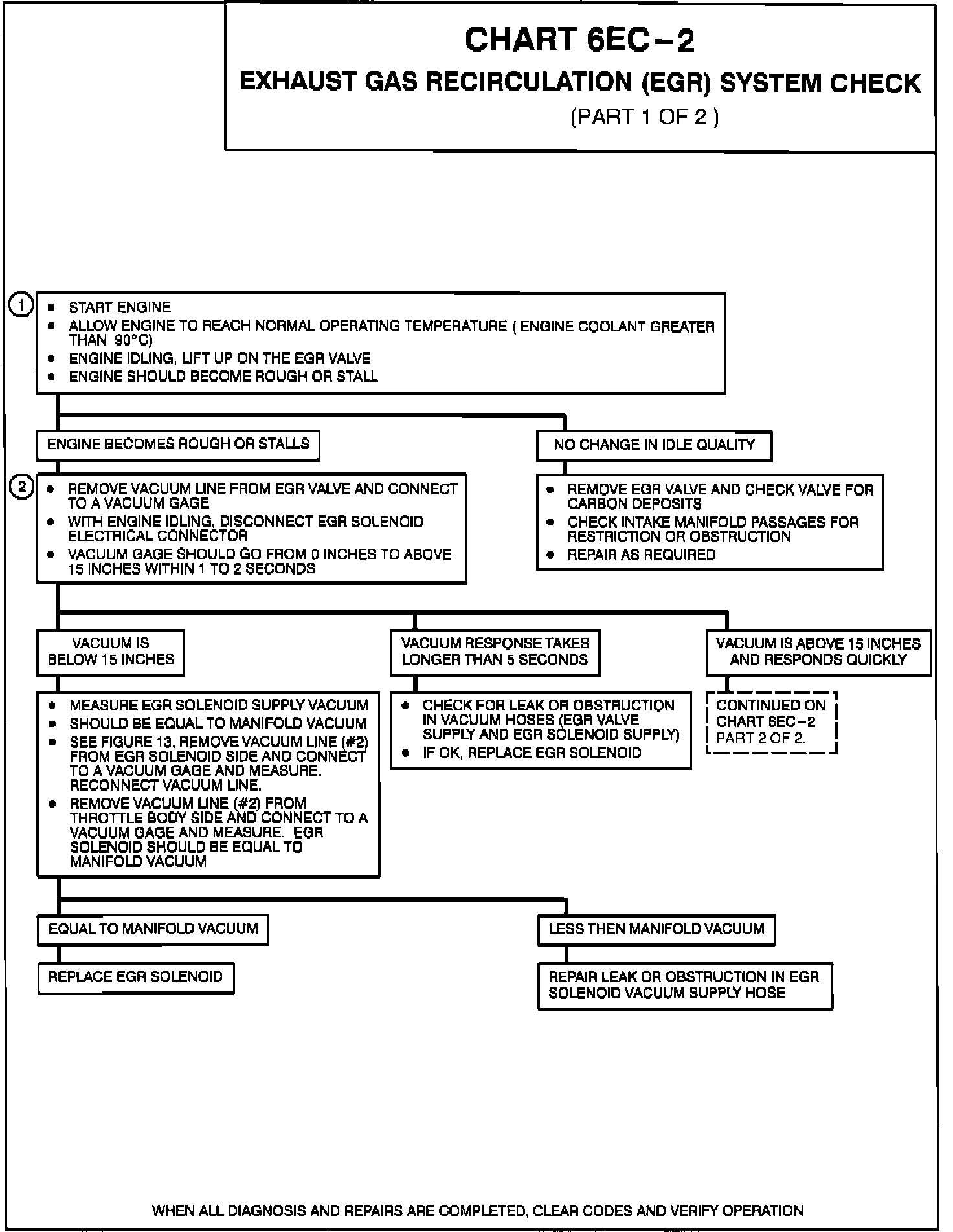 2. Connect a vacuum gauge to the EGR valve vacuum supply. There should be no vacuum with the engine idling. If there is, follow chart above.