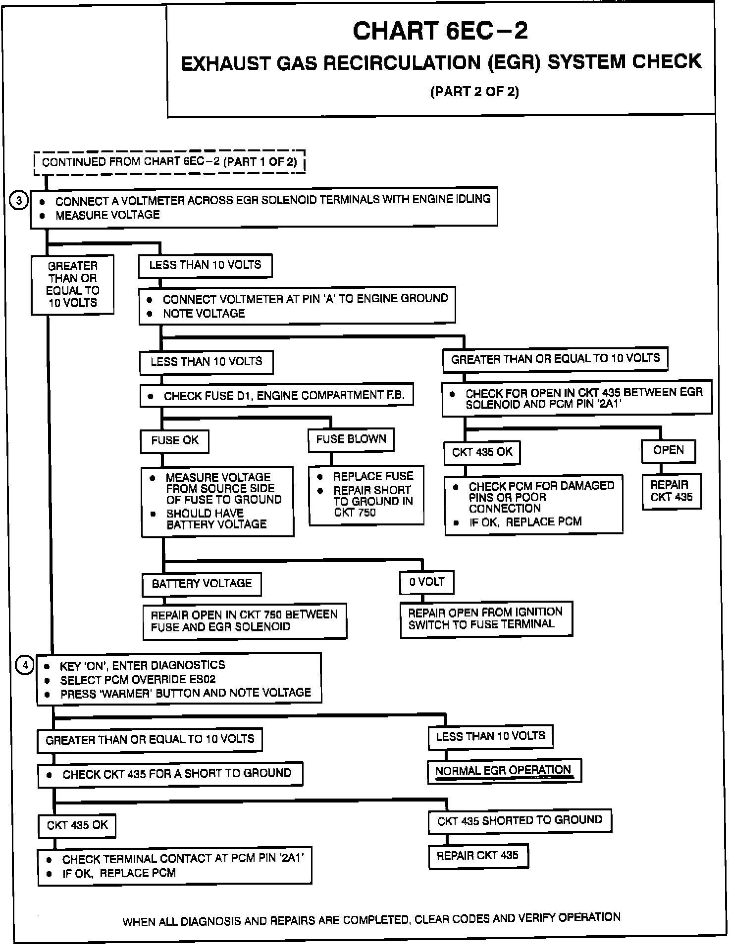 3. With engine idleing, EGR solenoid should be energized. Voltmeter across EGR solenoid terminals should be greater than 10 volts.