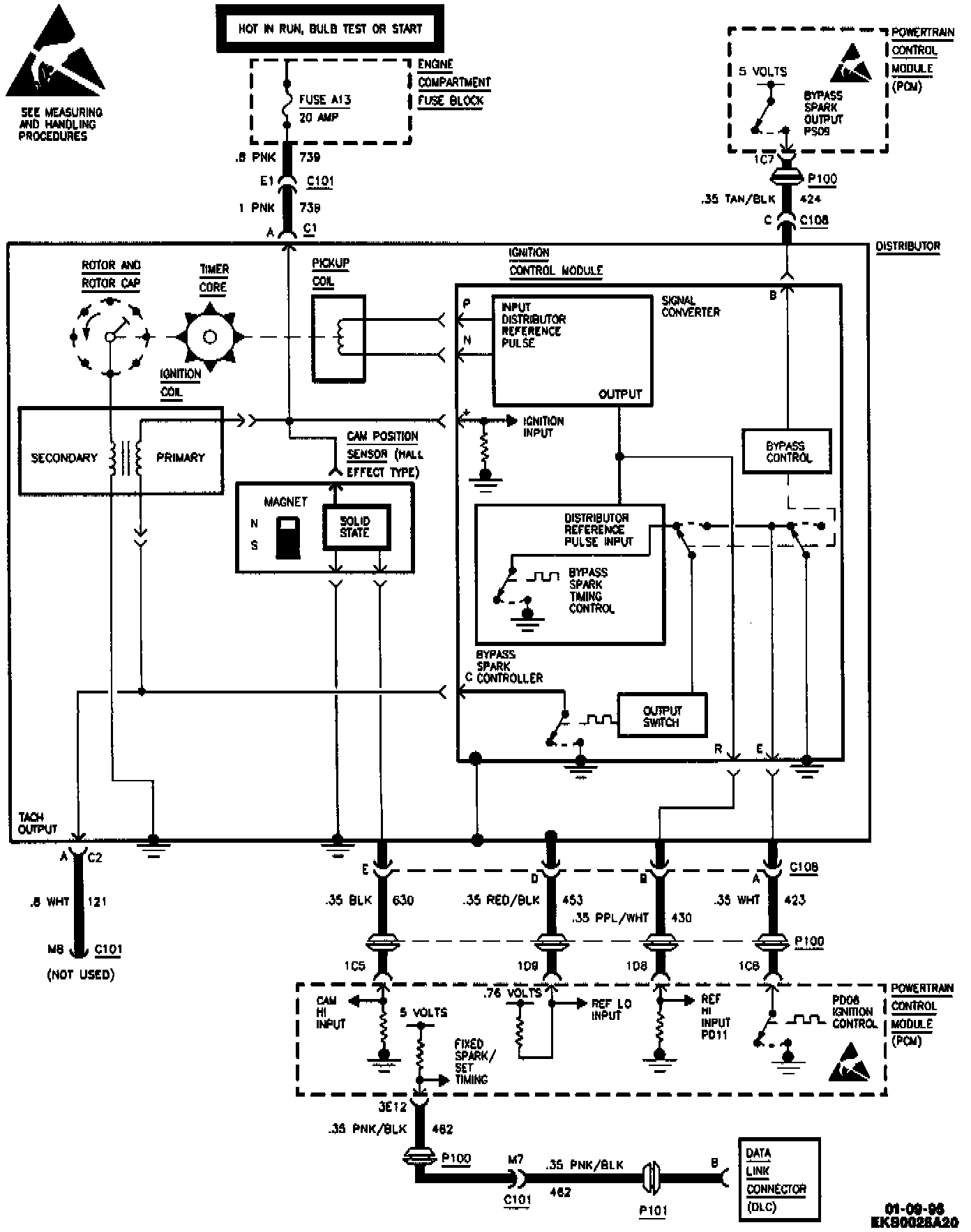 All spark timing changes are performed electronically by the PCM. The PCM monitors information from various engine sensors, computes the desired spark timing and signals the ICM to change the timing accordingly. A backup spark advance system is programmed into the ICM in case of PCM failure. No vacuum or mechanical advance are used.