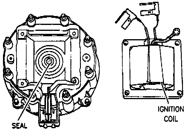 4. Remove ignition coil attaching screws and lift coil with leads from cap inspect cap for signs of carbon tracking on inside of cap below coil.