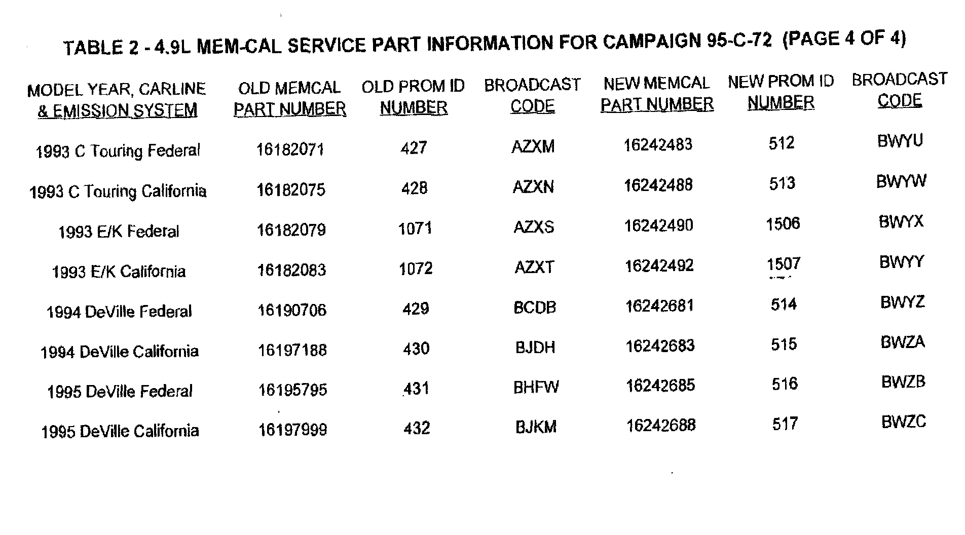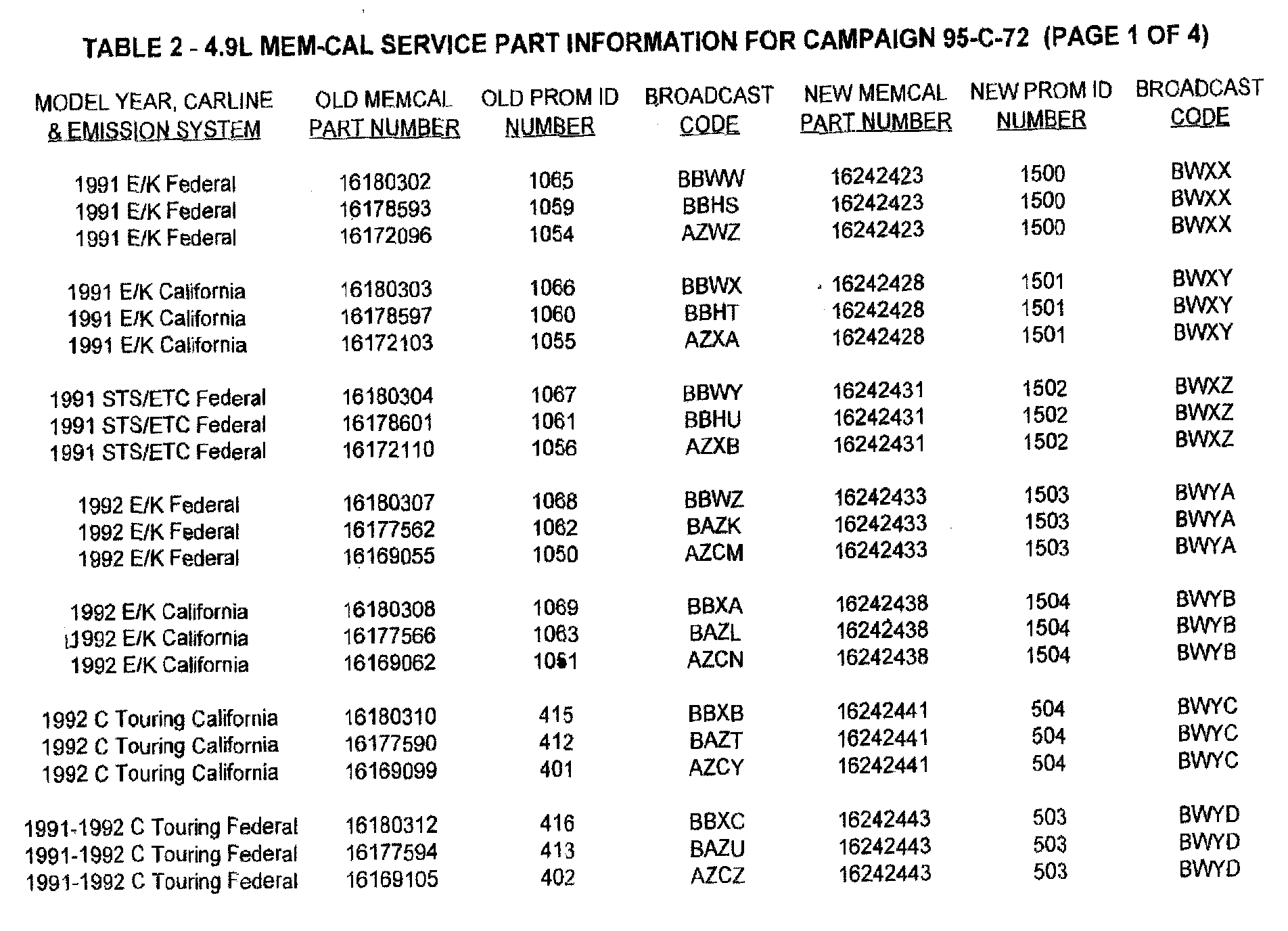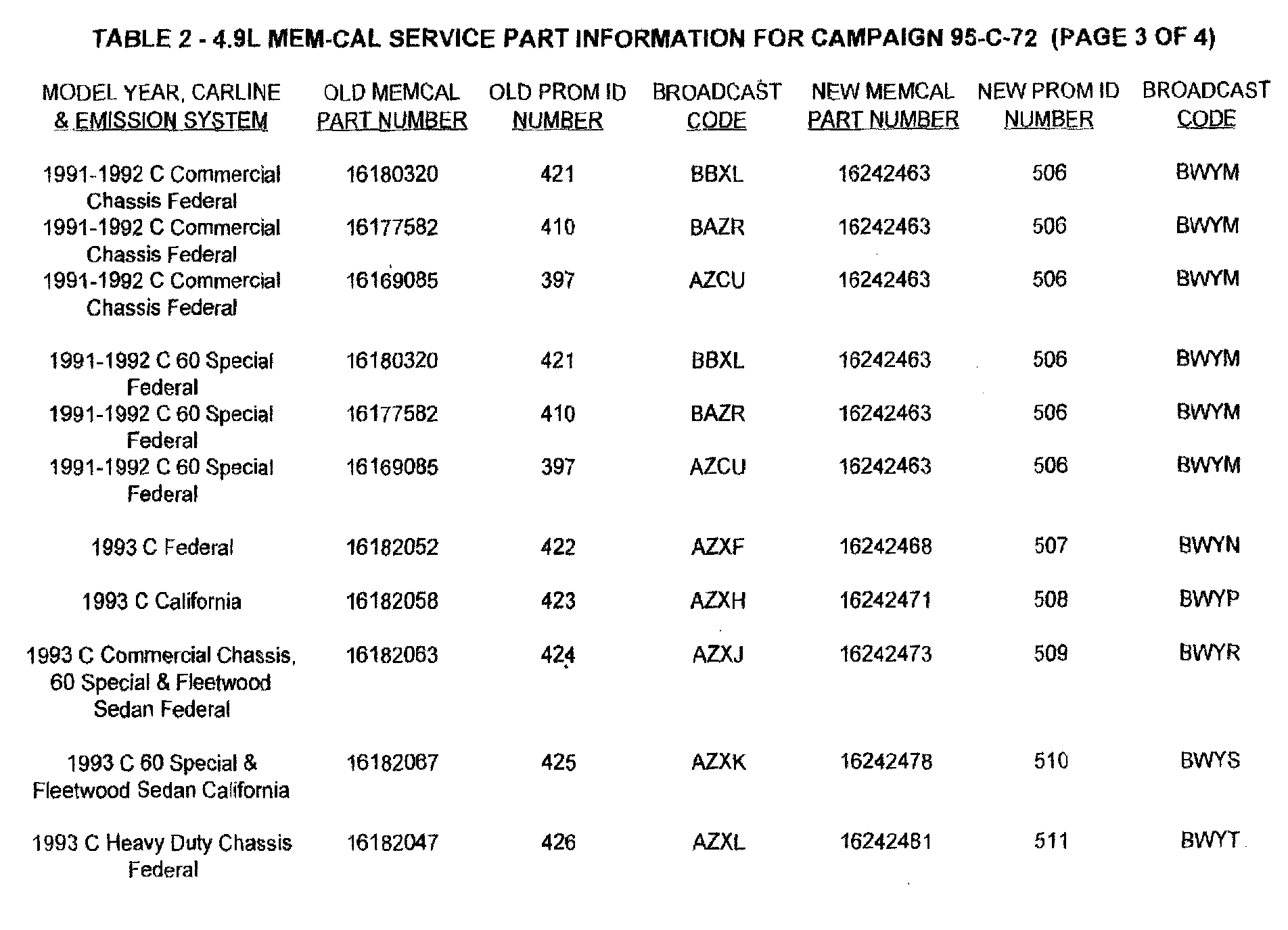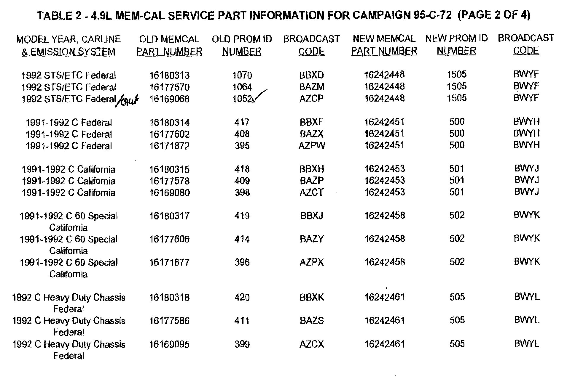 2. After determining the PROM ID number of the Mem-Cal which is currently installed in the vehicle, refer to Table 2 of this bulletin. Find the model year, carline and emission system of the vehicle being serviced. Identify the old Prom ID number as recorded on the repair order. Determine the new Prom ID number and Mem-Cal part number to be installed in the PCM as indicated on the right side of the table.