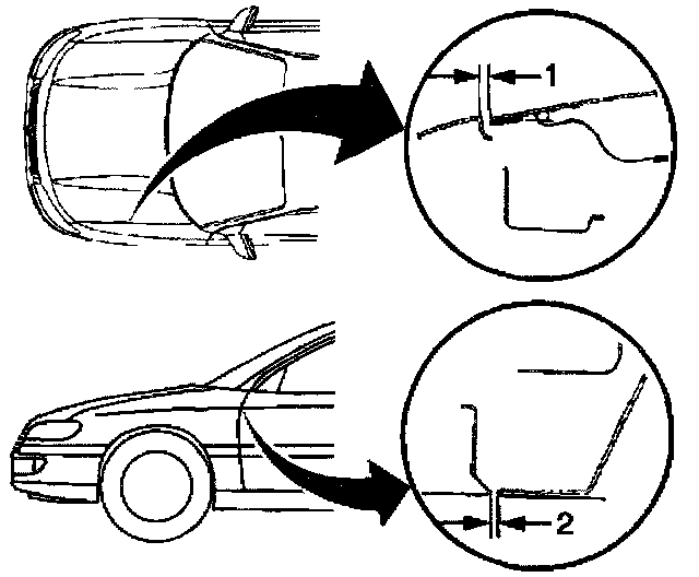 4. Adjust the fender-to-front door clearance (2) to 5 mm + 1 mm.