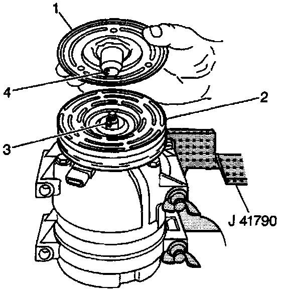 3. Align the shaft key with the shaft keyway in the clutch plate and the hub assembly and place onto the compressor shaft (3).