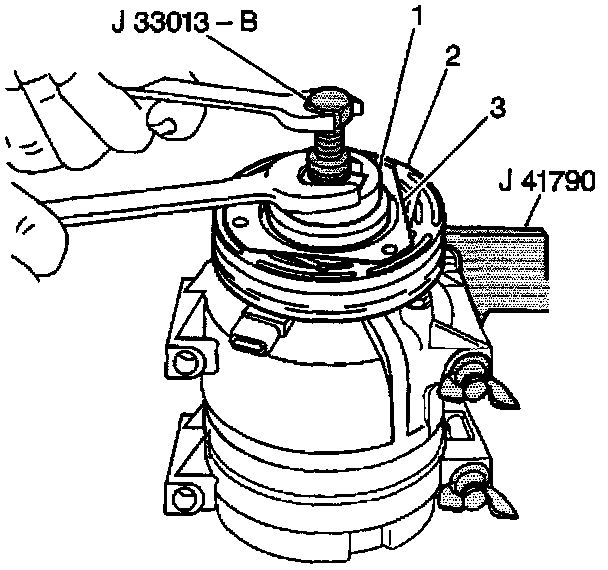 5. Install the J33013-B and bearing tools (1) onto the clutch plate (3) and the hub assembly (2).