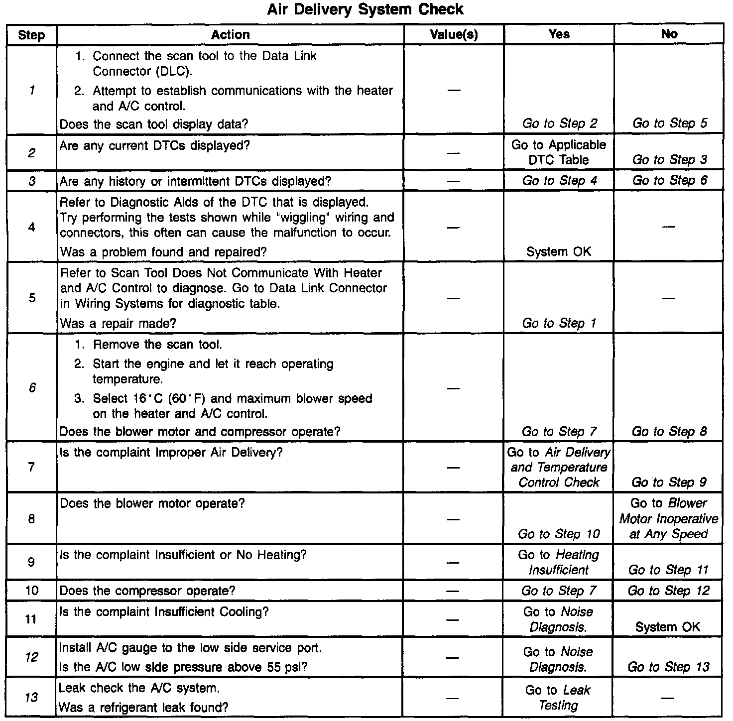 The Air Delivery System Check is an organized approach to identify problems associated with the heater & A/C control ability to control air delivery. This check must be the starting point for any air delivery or temperature control complaint, and will direct you to the next logical step in diagnosing the complaint. The heater and A/C control is a very reliable component and is not likely the cause of the malfunction. Most system complaints are linked to faulty wiring and connectors, and occasionally to components. Understanding the computer system and using the tables correctly will reduce diagnostic time and prevent unnecessary parts replacement.