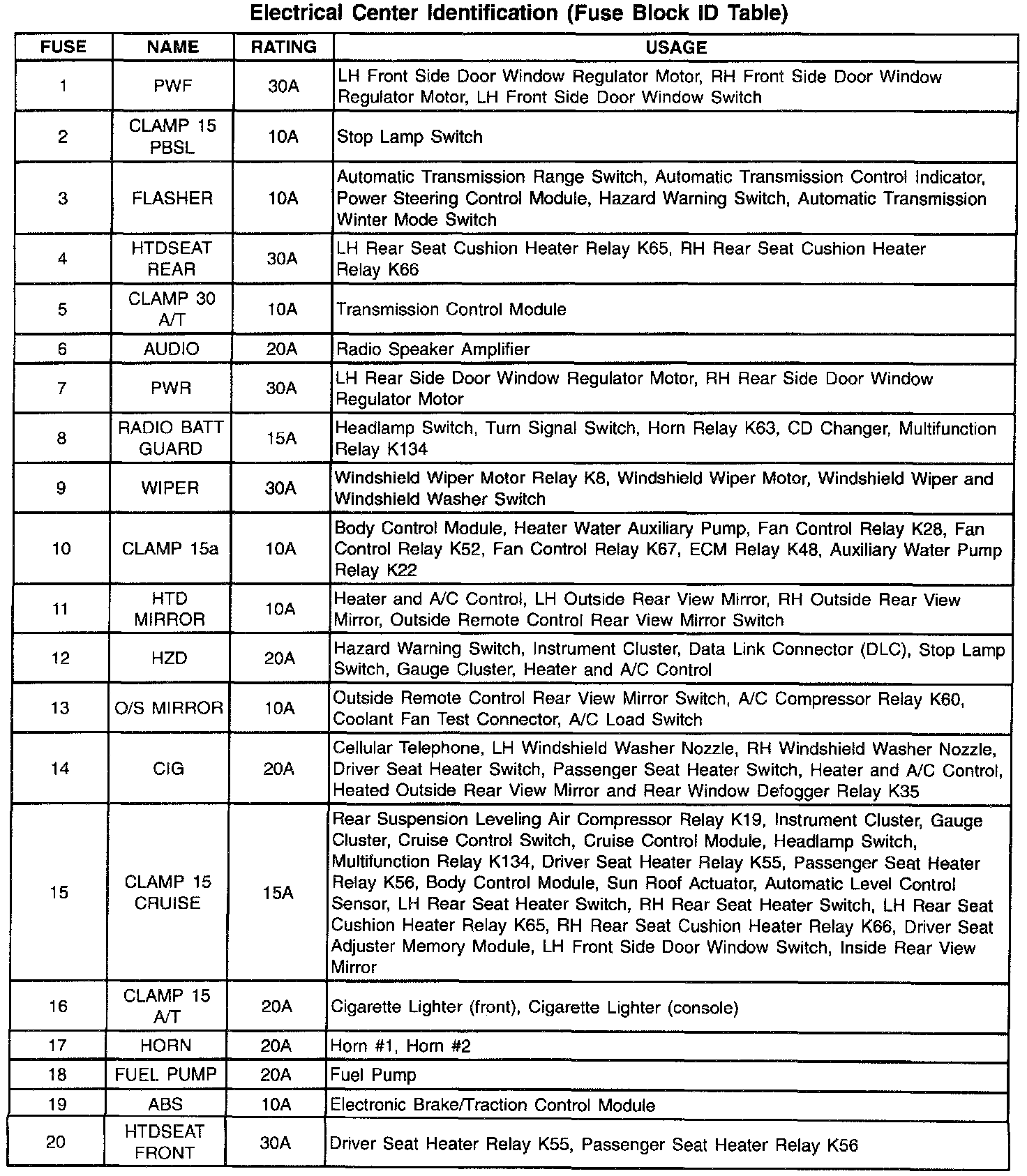 Electrical Center Identification (Fuse Block ID Table)(Part 1 Of 2):