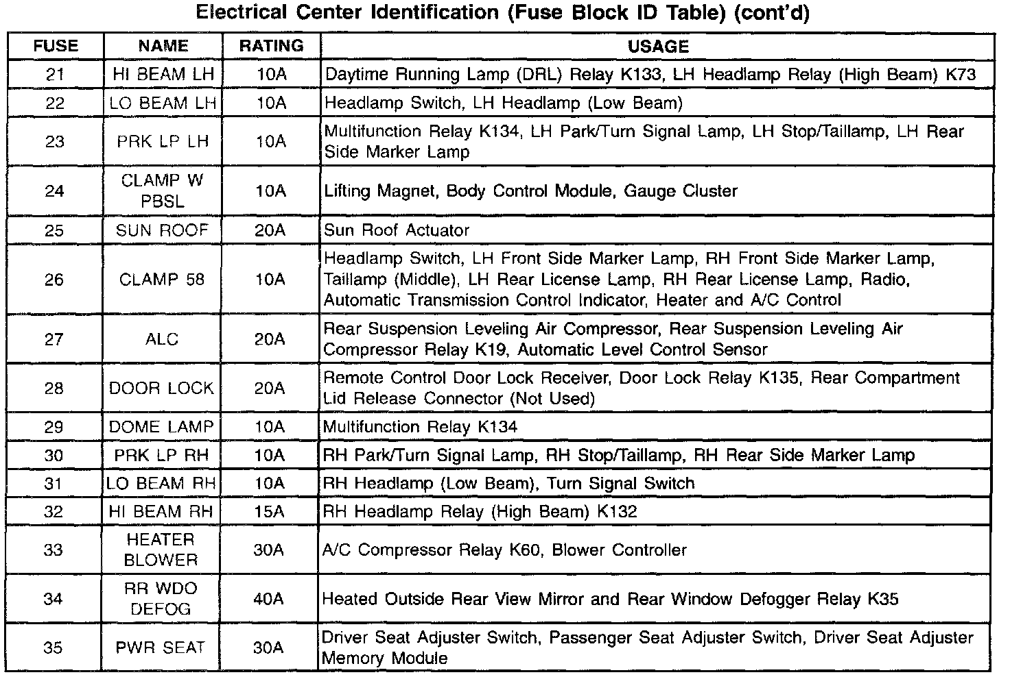 Electrical Center Identification (Fuse Block ID Table)(Part 2 Of 2):