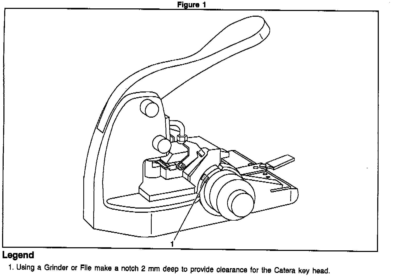 ^ Ilco/Unican - The Ilco/Unican Exacta MK1 equipment can be modified by grinding a small notch in the base (as shown in Figure 1) so that the key will sit squarely in the cutter. Call the Manufacturer at 1-800-334-1381, extention 281, or 1-800-GM-TOOLS to order an accessory kit which consists of: