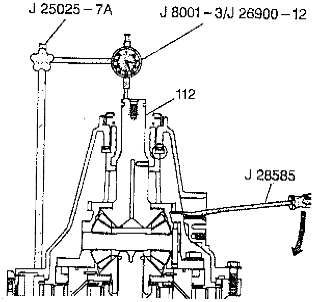 1. Install the J25025-7A long dial indicator post and the J 8001 dial indicator.
