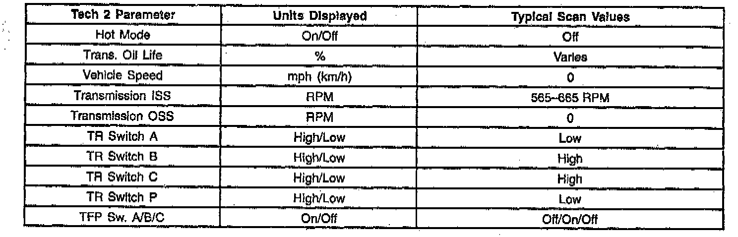If you have completed the On-Board Diagnostic (OBD) system check, if the diagnostics are functioning properly and if no DTCs display, you may use the Typical Scan Values in the table for comparison within the appropriate transmission. These typical values are an average of display values recorded from normally operating vehicles. They represent the display from a normally functioning system.