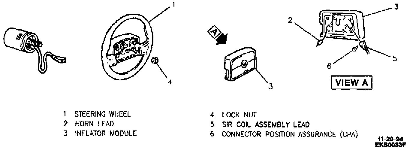 CAUTION: When carrying a live inflator module, make sure the bag and trim cover are pointed away from you. In case of an accidental deployment, the bag will then deploy with minimal chance of injury. Never carry the inflator module by the wires or connector on the underside of the module. When placing a live inflator module on a bench or other surface, always face the bag and trim cover up, away from the surface. This is necessary so that a free space is provided to allow the air bag to expand in the unlikely event of accidental deployment. Never rest a steering column assembly on the steering wheel with the inflator module face down and column vertical. Otherwise, personal injury could result.