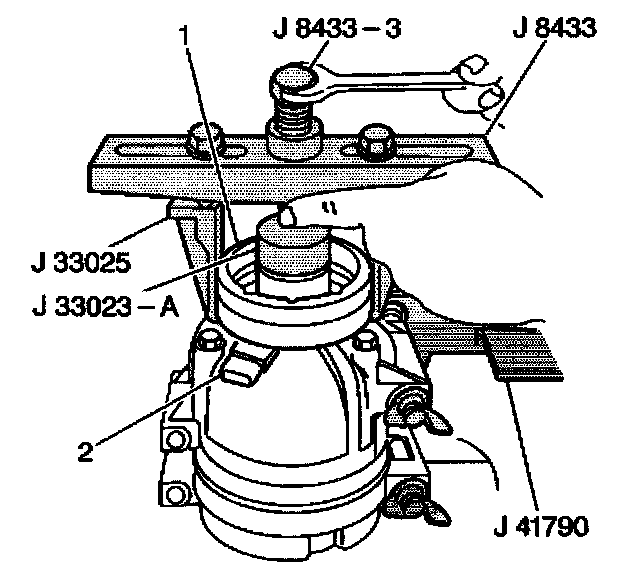 7. Install the J 8433 onto the compressor clutch coil (1) and tighten the puller leg bolts.