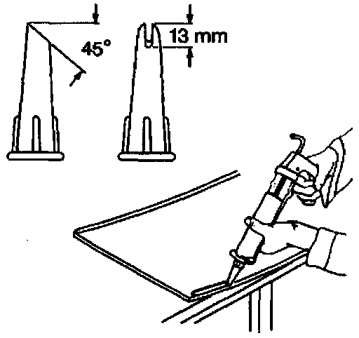 ^ If extended method is being used, cut the tip of the application nozzle at a 45°angle with a 13 mm (1/2 in) groove to provide a bead of approximately 8 mm (5/16 in) wide x 13 mm high (5/16 in x 1/2 in).