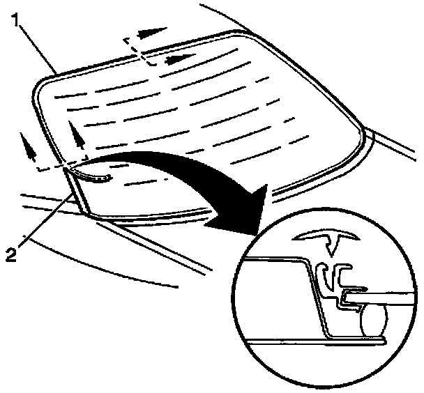 13. Install the rear window reveal molding (1) into the reveal molding retainers (2).