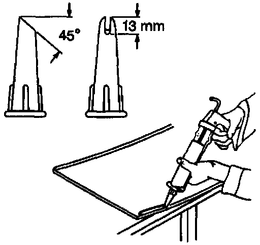^ If extended method is being used, cut the tip of the application nozzle at a 45°angle with a 13 mm (1/2 in) groove to provide a bead of approximately 8 mm (5/16 in) wide x 13 mm high (5/16 in x 1/2 in).