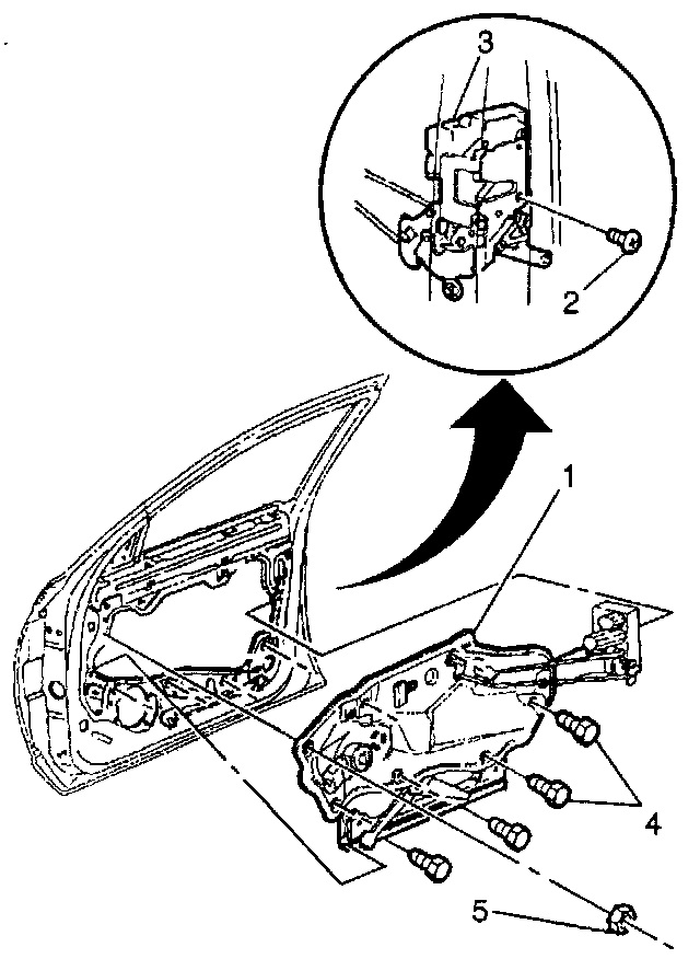 8. Remove the door module (1) with the latch/lock module (3) connected by the linkage.