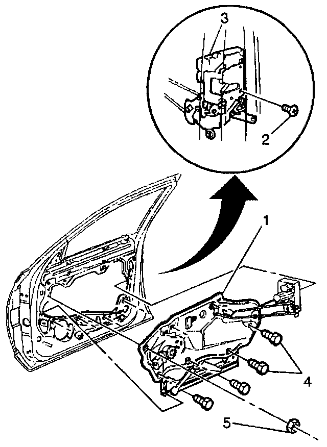 1. Position the door module (1) and latch/lock (3) to the door. Perform the following steps.