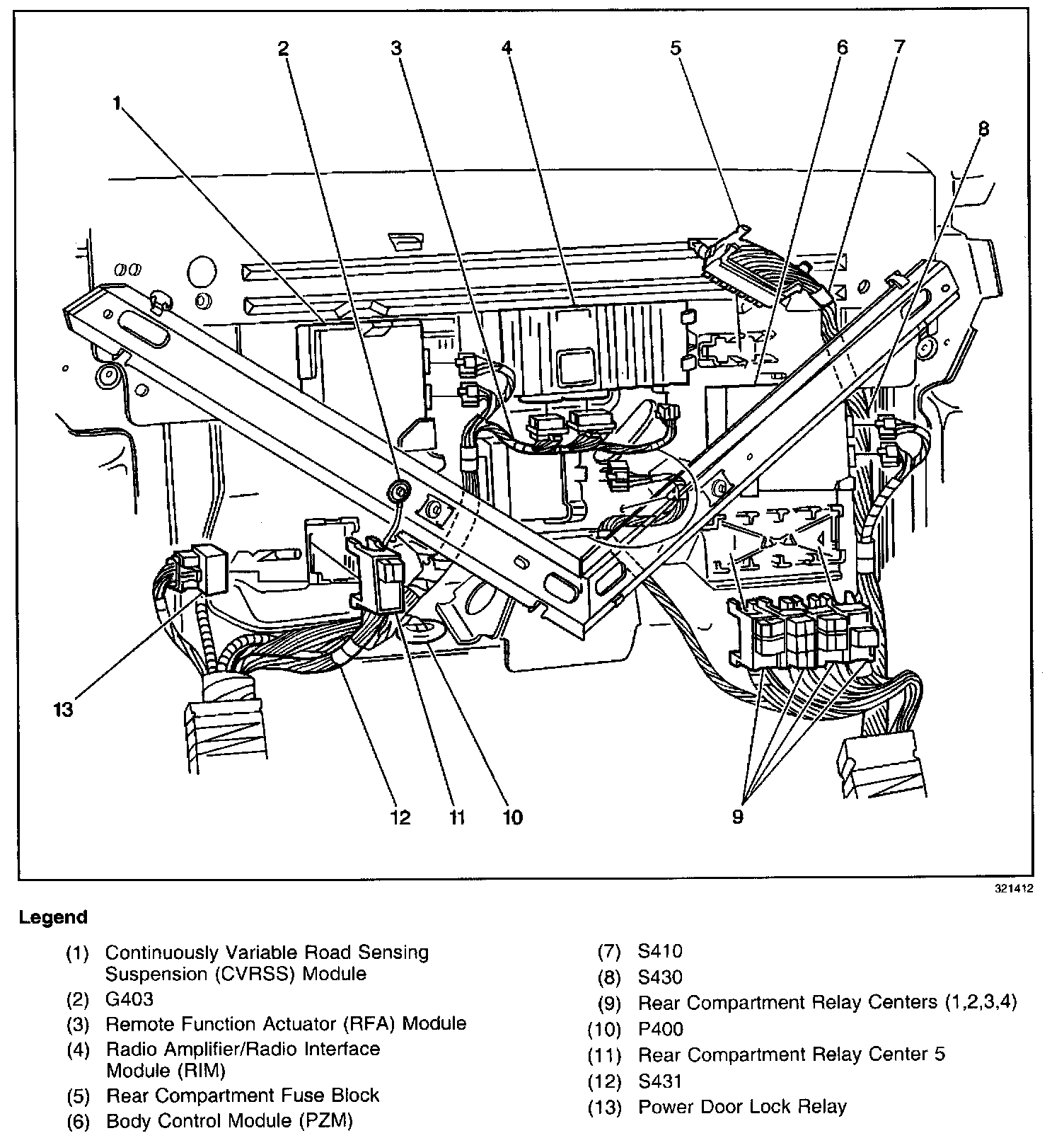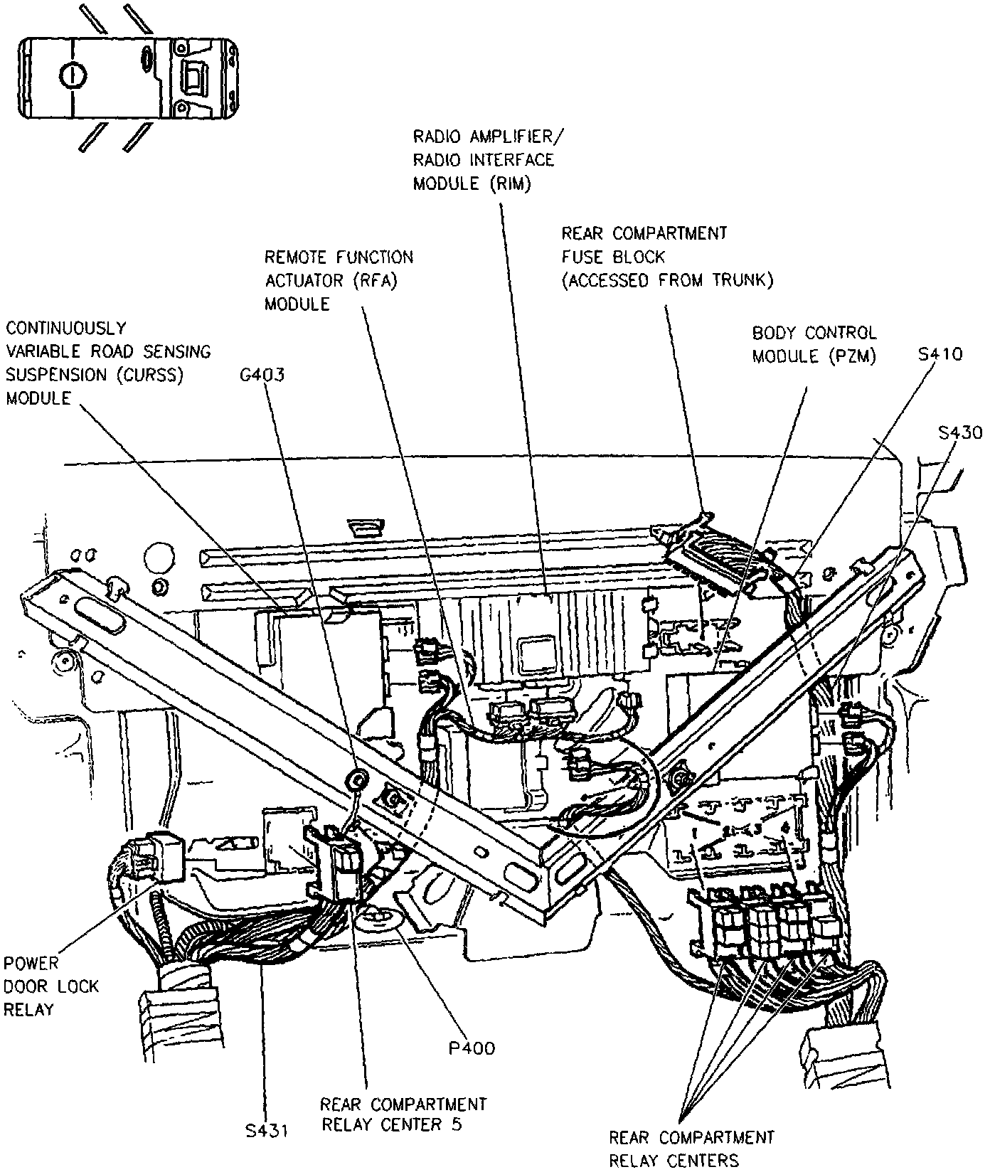 In the left rear of the passenger compartment, behind the rear seat, on the electronics bay
