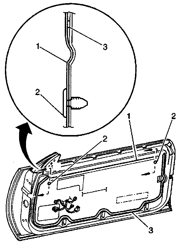 3. Install the fasteners (2) to the upper corners of the water deflector (1). The fasteners serve as a guide in order to position the water deflector (1) on the door panel (3).