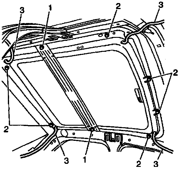 8. Remove the six sunroof module mounting bolts (2).