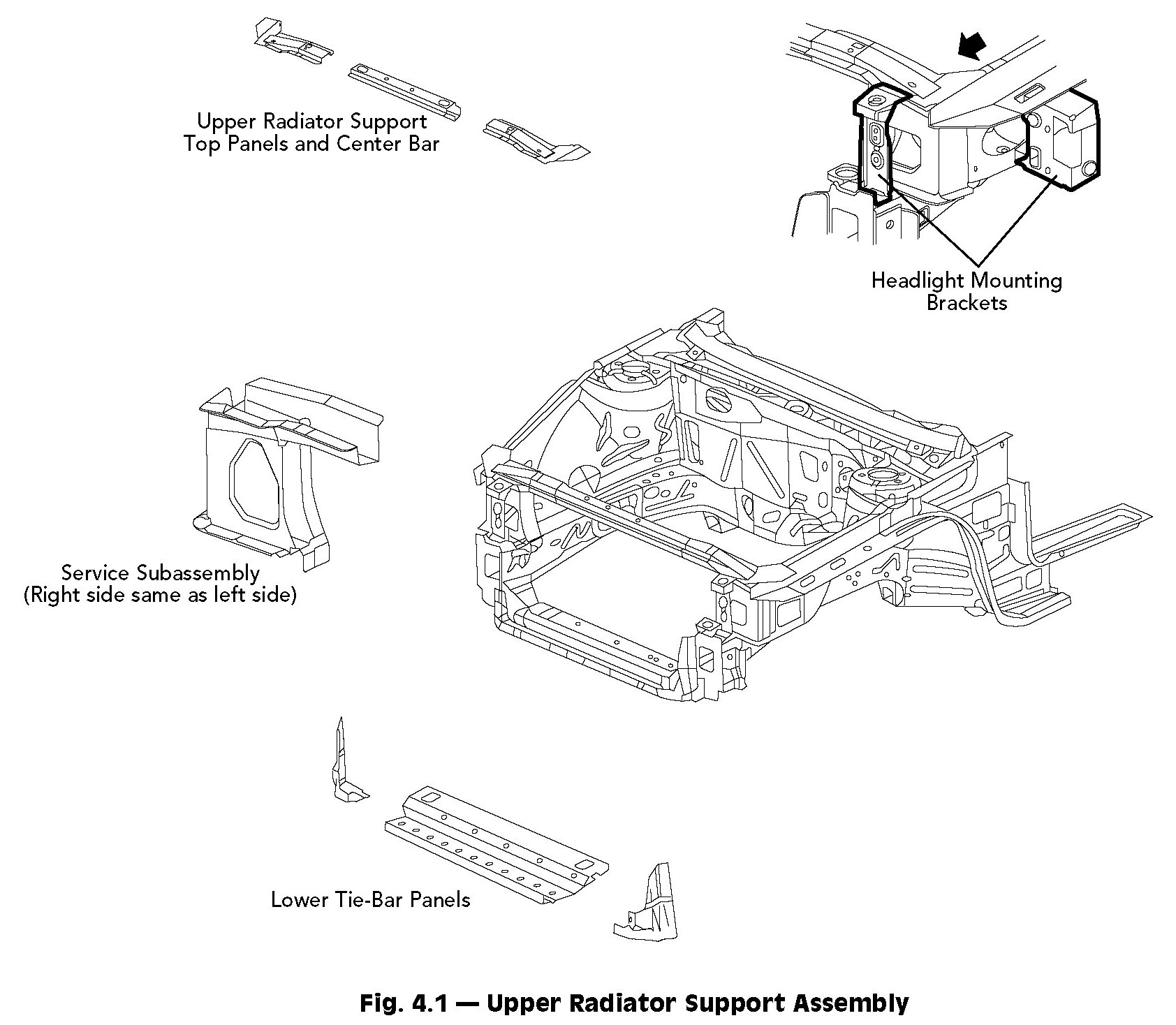 There are two service sub-assemblies, each made up from three of the nine upper panels. There are no factory welds along the rear edge of these assemblies. The rear edge of these assemblies sandwich the front edge of the wheelhouse apron. After positioning the rest of the radiator support components, check the fit using three dimensional measuring equipment. Plug weld all the panels as necessary, including the rear edge of the sub-assemblies to the wheelhouse apron.