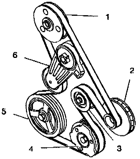1. Thread the drive belt through all the pulleys except for the power steering pump (1) and the drive belt tensioner (6).