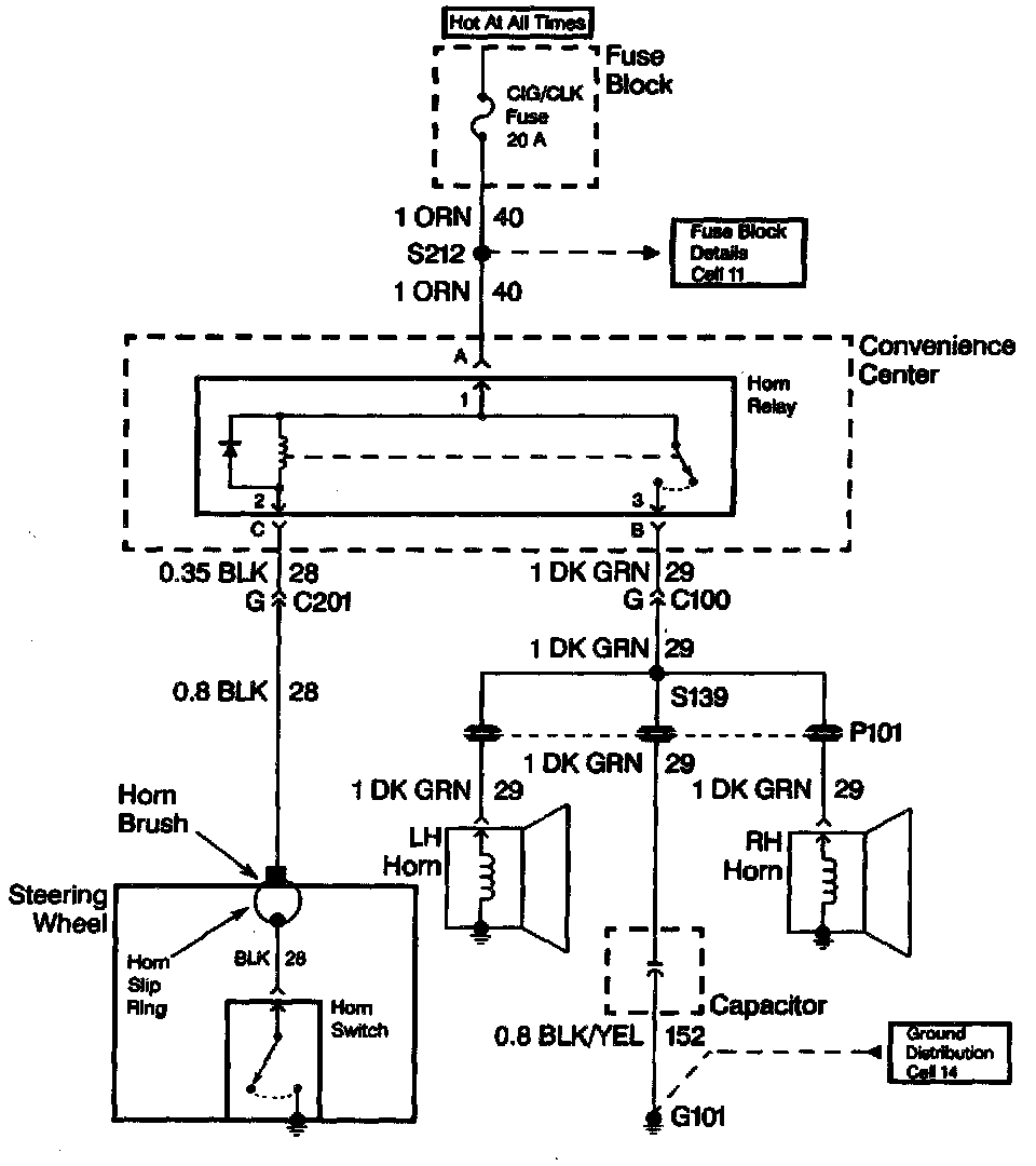When diagnosing a horn problem use the service information located in the Horns service category. The following schematic is a typical example of a schematic with its supporting text.