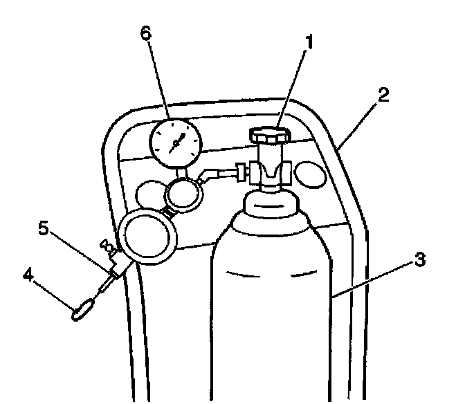 10. Disconnect the black hose (4) that connects the nitrogen cylinder to the cart at the pressure regulator (5) by unthreading the knurled nut on the pressure regulator.