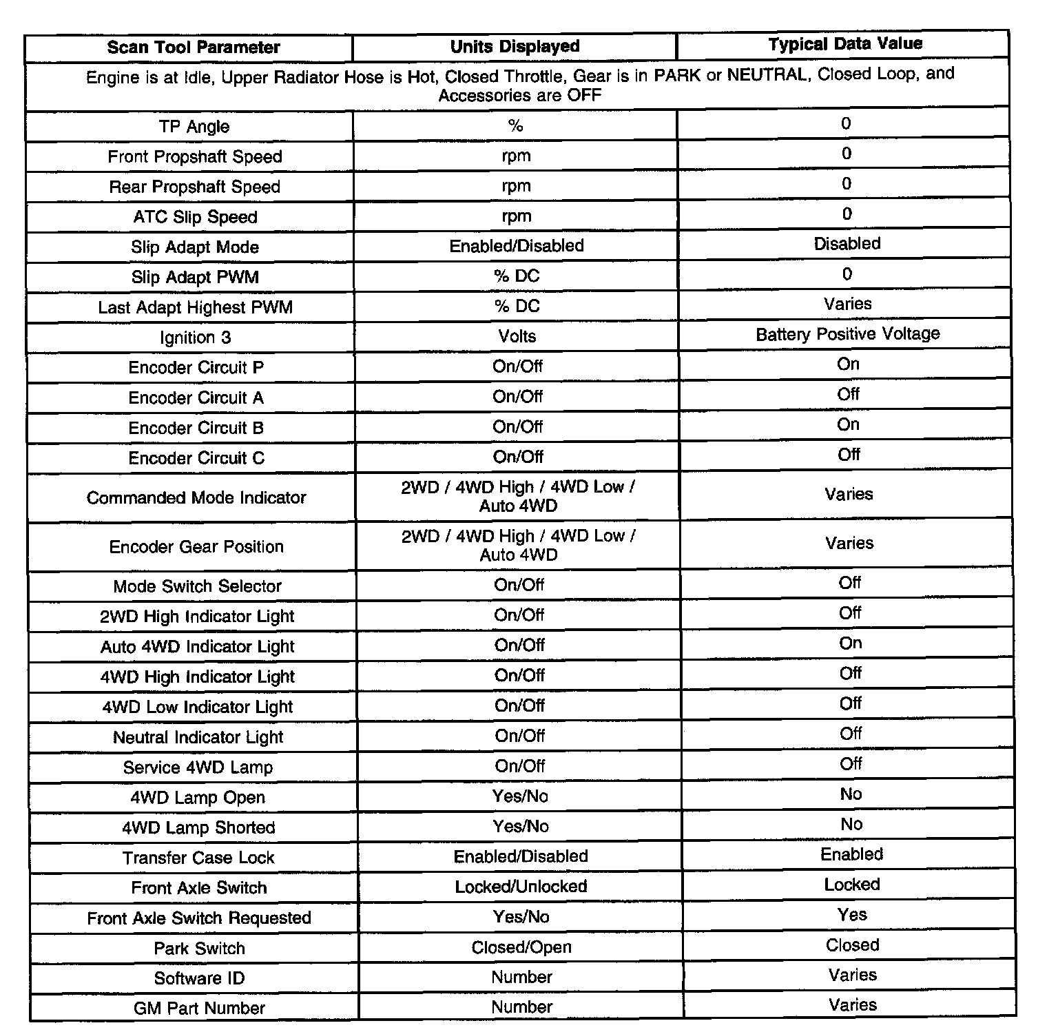 Scan tool values from a properly operating system may be used for comparison with the automatic transfer case system you are diagnosing. The Transfer Case Scan Tool Data List represents values recorded under the following conditions: