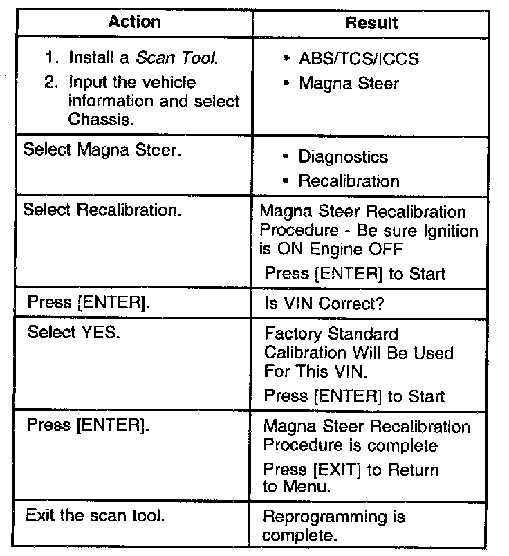 system has only one response mode. Use a Scan Tool and the following table in order to recalibrate the Variable Effort Steering system.