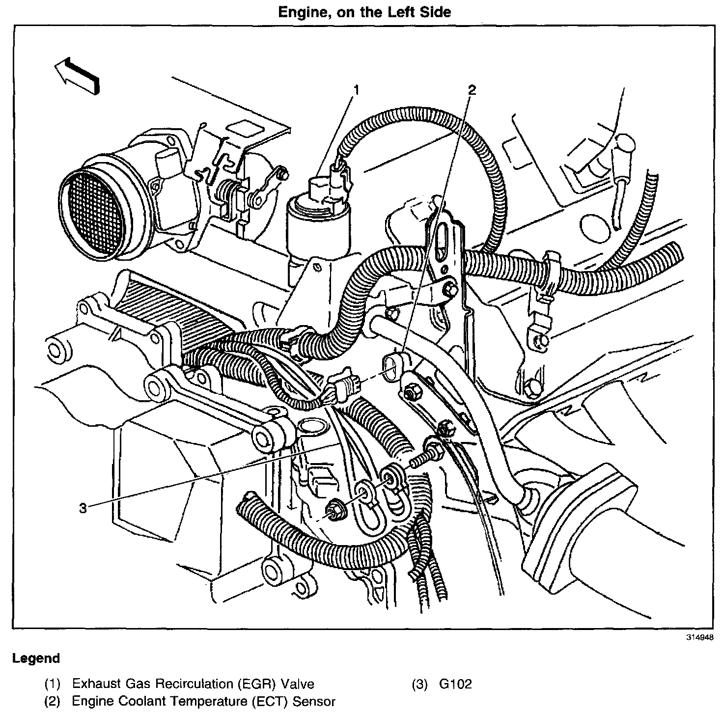 In the left rear corner of the engine, below the exhaust gas recirculation valve