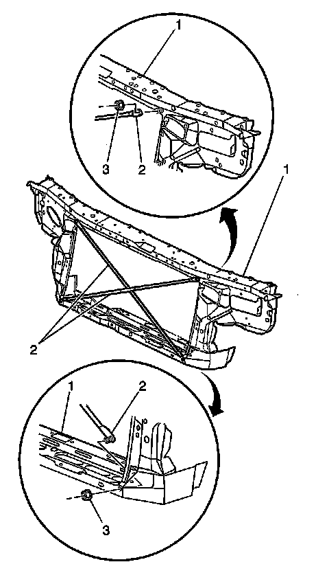 3. Remove the nuts (3) that retain the diagonal brace(s) (2) to the radiator support (1).