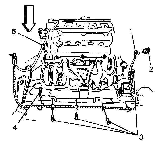 9. Remove the bolts (3) attaching the cable harness clips to the engine frame.