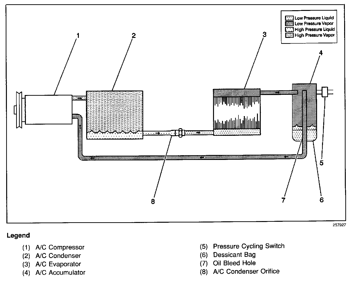 A switch that senses low side pressure as an indicator of the evaporator pressure controls the refrigeration cycle, or the on and off operation of the compressor. The cycling pressure switch is the freeze protection device in the system. The switch also senses refrigerant pressure on the suction side of the system. This switch is located on a standard service low-side fitting. With air temperatures of 16°C-26°C (60°F-800°F), the increased pressures within the charged air conditioning system closes the contacts of the pressure switch.
