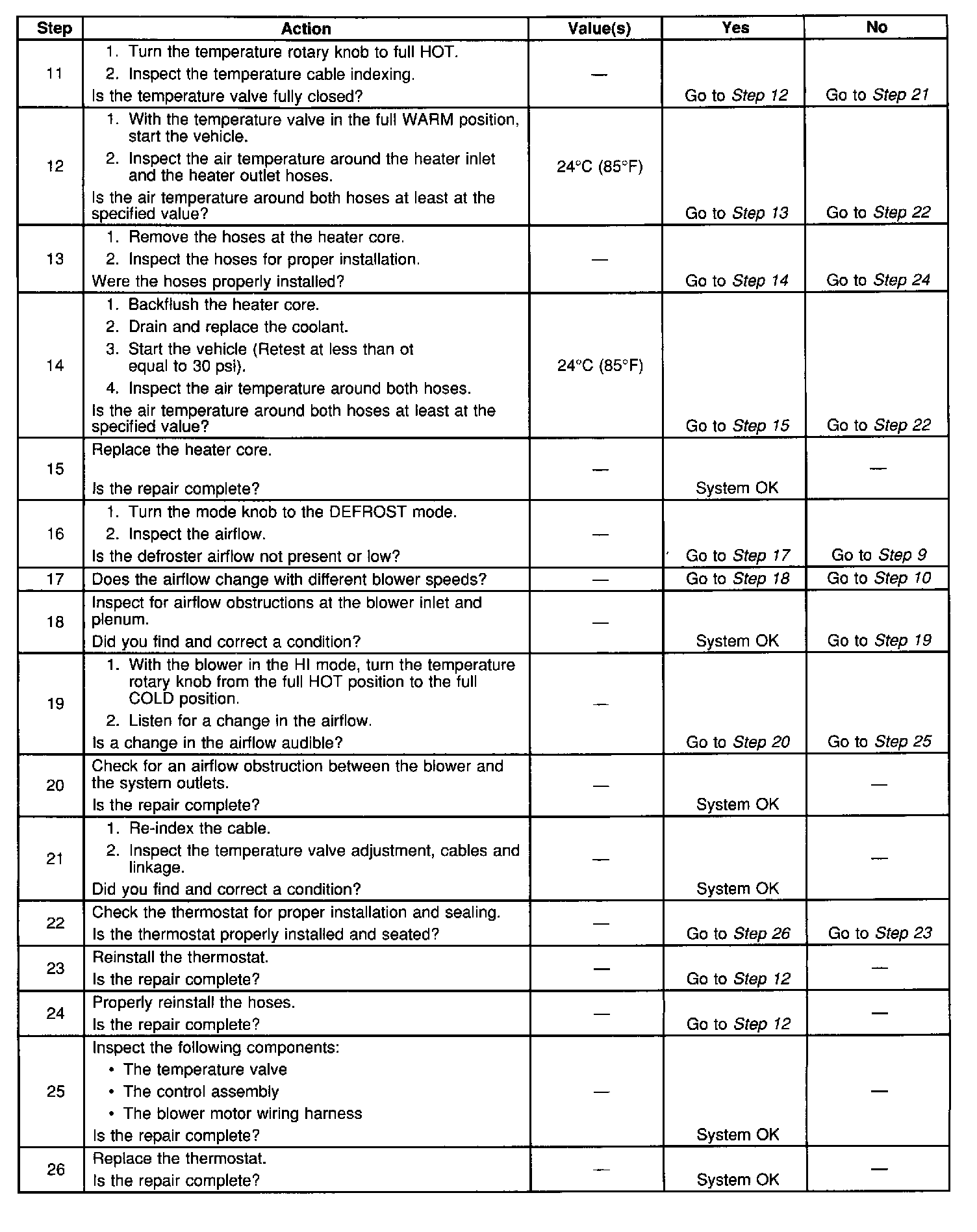The most likely causes of insufficient heating outside the heater system include a low coolant level, a faulty thermostat, a partially or fully clogged heater core or hose, an obstruction to the air circulation, or an air leak past a faulty seal into the passenger compartment. For the proper temperature verification, use the Tech II