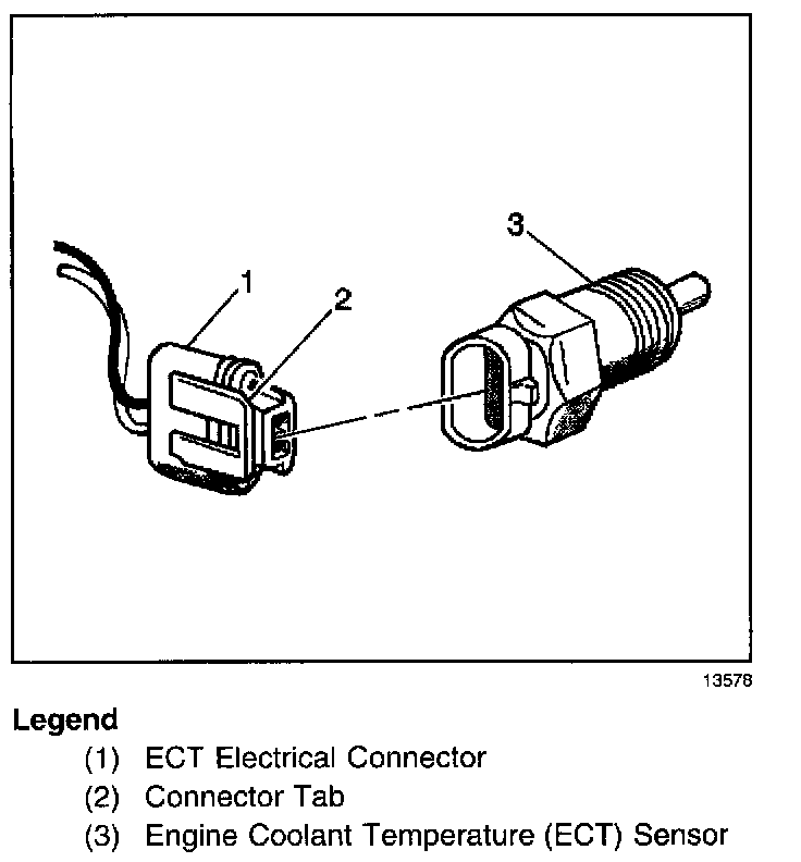 The engine coolant temperature sensor is a thermistor, a resistor which changes value based on the temperature, mounted in the engine coolant passage. A low coolant temperature produces a high resistance of 100,000 ohms at -40°C (-40°F) while a high temperature causes a low resistance of 70 ohms at